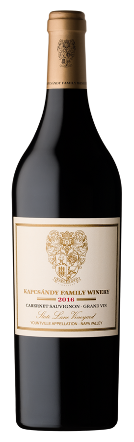 The 2015 Cabernet Sauvignon Grand Vin State Lane Vineyard sports a deep purple-black color and has a classic nose of crushed black currants, black plums and cedar with hints of dried Mediterranean herbs, underbrush, smoked meats and cloves. Medium to full-bodied, the palate has youthful exuberance with tight-knit, muscular black fruits and spicy suggestions framed by firm, grainy tannins, finishing with great length and depth. Should age incredibly!